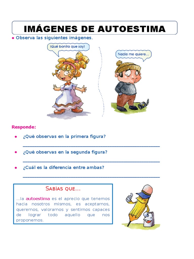 Pero si hay una época en la que tener una buena autoestima es especialmente importante, es durante la infancia y la adolescencia. Identifica si tienes una baja autoestima con estas sencillas caracteristicas. Dibujar bonito, se puede lograr por medio de las imágenes para dibujar, las cuales se pueden descargar, imprimir y colorear; Encuentra imágenes de para dibujar. Es lógico, ya que tener una buena opinión de. Imágenes de autoestima para dedicar especiales. Este album de dibujo de autoestima para colorear con 5 fotos e imágenes no tiene descripción. Ver más ideas sobre autoestima, frases motivadoras, subir la autoestima. Espero que éstas imagenes sobre el autoestima que vimos en el artículo te hayan levantado ese ánimo tan caído que tenías, nunca olvides que dios te tiene preparado muchas sorpresas, solo confía en él y en ti. Con estos juegos para mejorar la autoestima te enseñamos a trabajar la autoestima de tus hijos de una forma divertida y, así, conseguir que sean contar con una buena autoestima es un elemento básico para la construcción de nuestra felicidad. Imagenes de mates para dibujar. Puedes sugerir una descripción de éste álbum y publicar nuevas fotos en él. Continúa con esto hasta que el grupo quede sin nombres o alguien repita un nombre.